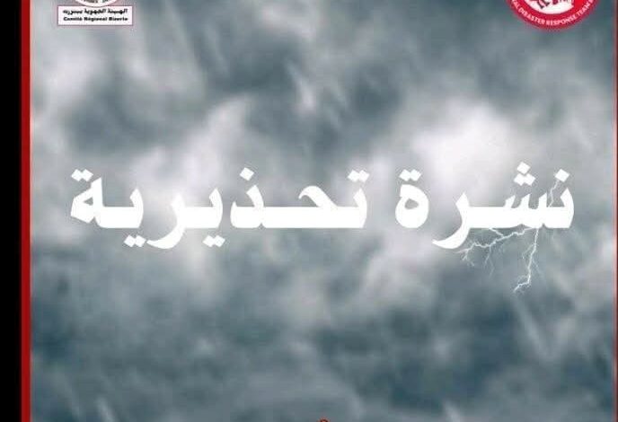 في اطار متابعة الوضع الجوي والتقلبات المناخية المنتظرة ووضع ولاية بنزرت وباجة و جندوبة بتصنفها باللون البرتقالي من طرف المعهد الوطني للرصد الجوي بداية من مساء اليوم الاربعاء 28 جانفي 2026 وتبعا لنشرة المعهد الوطني للرصد الجوي بهبوب رياح قوية نسبيا باغلب الجهات تتراوح سرعتها بين 50 و 80 كم/س و تكون قوية جدا حيث تصل الى 100كم/س في شكل هبات بولاية بنزرت .باجة .جندوبة مع نزول امطار رعدية و احيانا غزيرة باقصى الشمال.