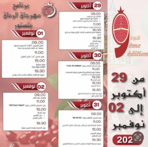 وتنطلق الفعاليات يوم 29 أكتوبر، بافتتاح رسمي يتبعه معرض لبيع المنتوجات المستخلصة من الرمان، وندوات علمية حول أهمية الرمان،ومحاضرات معمقة تتناول مواضيع تهم السياحة والتراث الأندلسي، وتتوج الأمسية بسهرة فنية كبرى يُحييها ثلة من الفنانين التونسيين.