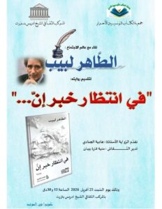 هذا العمل يقدمه الاستاذ محمد الصالح فليس على منبر المركب الثقافي الشيخ ادريس ببنزرت بعد أن قدم الاصدار الجديد للكاتب محجوب السميراني في نهاية الأسبوع الفارط. بالتعاون مع قدماء معاهد بنزرت. ليتواصل النشاط تباعا بتقديم كتاب في انتظار خبر إن …. للكاتب وعالم الاجتماع الطاهر لبيب يوم السبت المقبل بالاشتراك مع جمعية الكتاب الأحرار تقديم الاستاذة هادية الجنادي وسبق ان قدمت الفنانة التشكيلية لطيفة المالكي رسوماتها برواق المركب تحت عنوان ريحة البلاد.