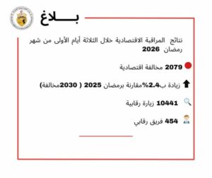 وقد أسفرت هذه الزيارات وفق بلاغ للوزارة اليوم الإثنين 23 فيفري 2026، عن تسجيل 2079 مخالفة اقتصادية، وذلك بزيادة بـ2،4 بالمائة مقارنة بنفس الفترة لرمضان الماضي