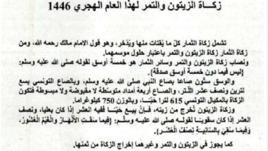 أعلن سماحة مفتي الجمهورية التونسية، هشام بن محمود أن نصاب زكاة الزيتون والتمر وسائر الثمار هو خمسة أوسق والوسق يساوي…
