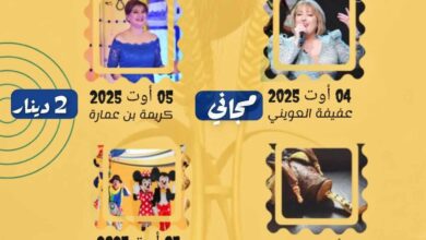 البرنامج: 4 أوت: سهرة مجانية مع الفنانة عفيفة العويني 5 أوت: عرض غنائي للفنانة كريمة بن عمارة (2 دنانير) 6…