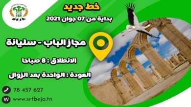 أعلنت الشركة الجهوية للنقل بباجة صباح اليوم 04 جوان 2021 على صفحتها الرسمية على الفايسبوك،عن افتتاح خط جديد بين المدن…