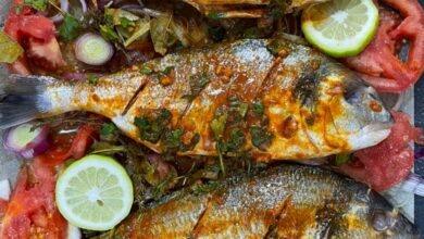 الدبارة: حوت دوراد مشوي وسلاطة برغل وسلاطة بيتنجان وطماطم مشوية