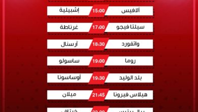 مباريات اليوم.. * الدوري الإيطالي: روما – ساسولو هيلاس فيرونا – ميلان * الدوري الانجليزي: بورنموث – إيفرتون واتفورد –…